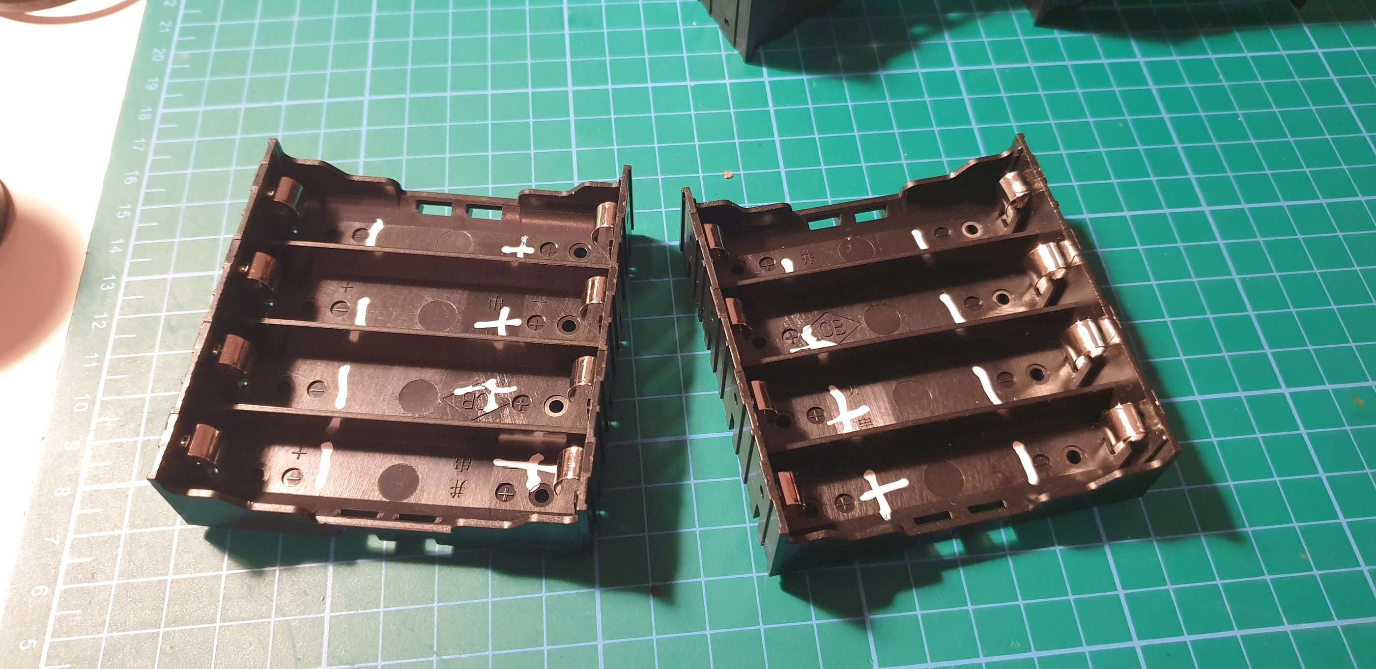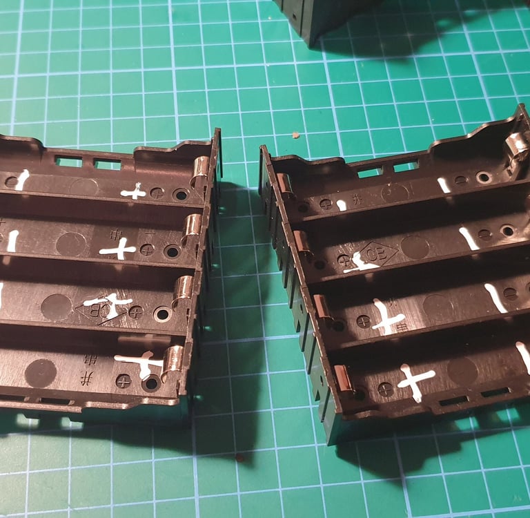 Once the enclosure is ready, it’s time to build the battery pack. We start by assembling the two holders. back to back. Pay attention to the polarity markings. I also label them with something clearly visible to reduce the risk of mistakes when inserting the cells
