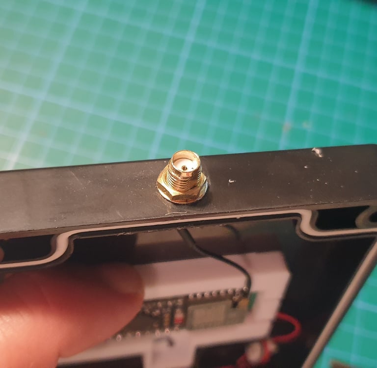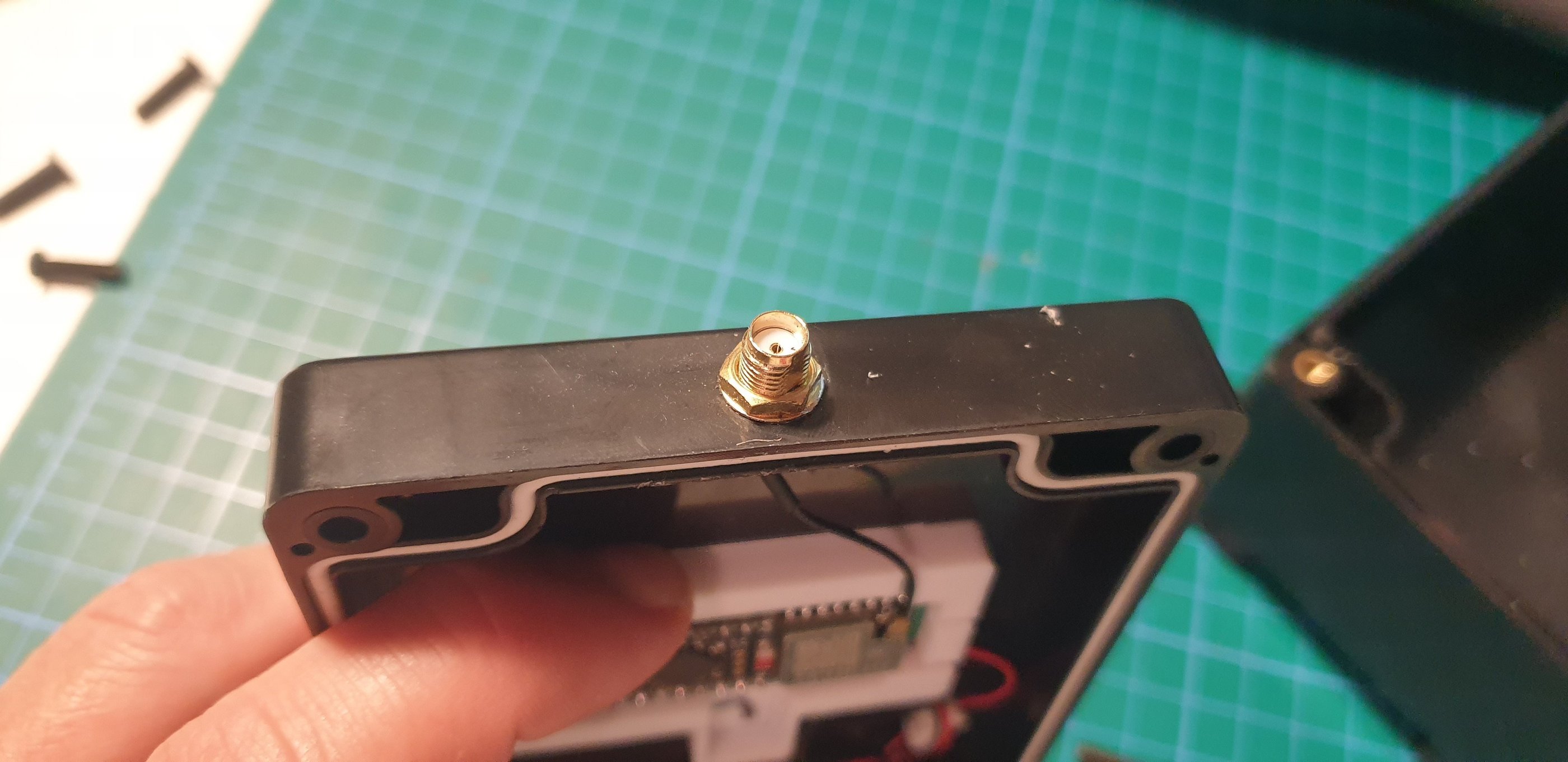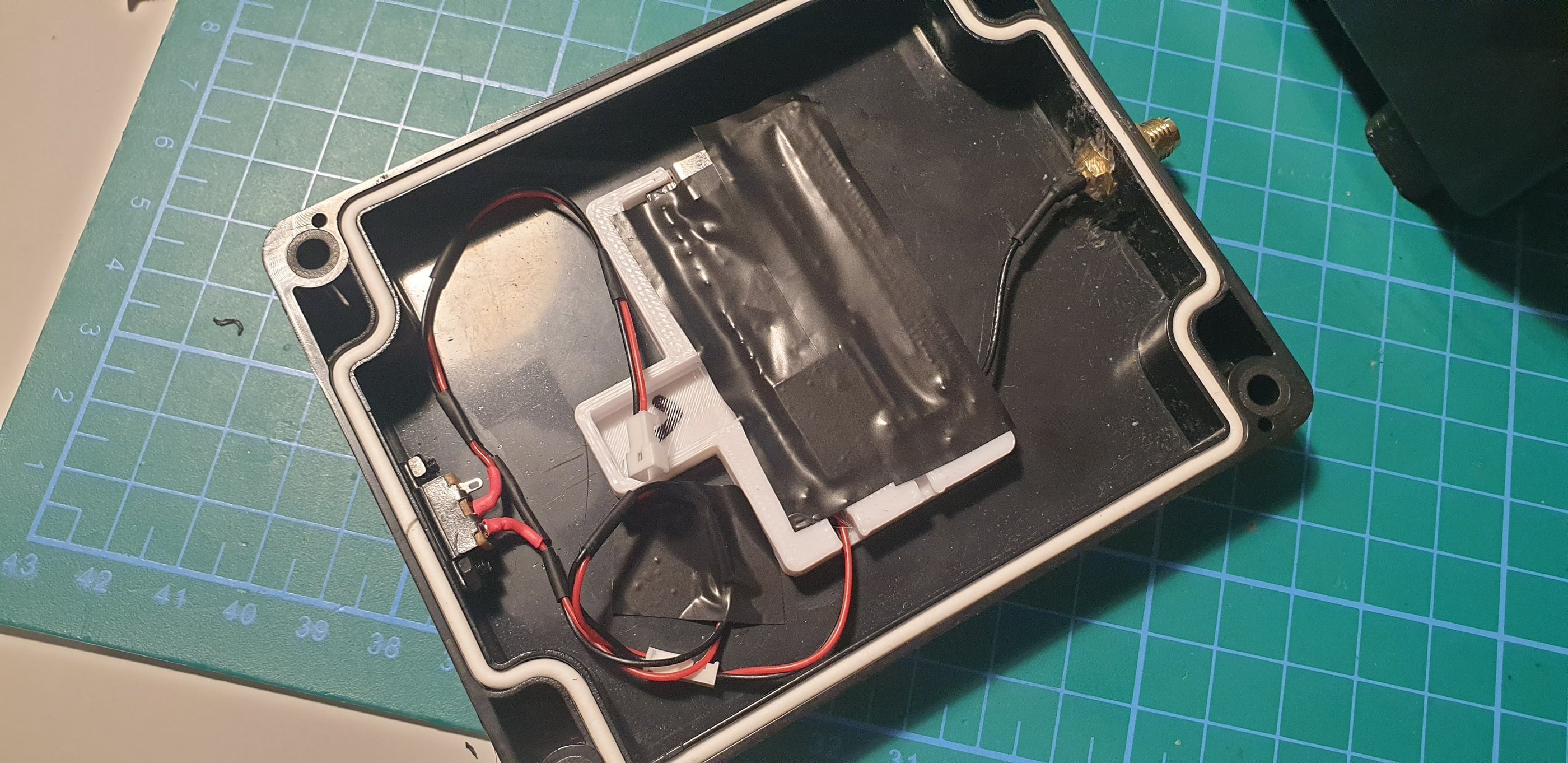 You’ll need to drill a few holes in the lid: one in the upper part to mount the SMA connector, and one in the lower part where I install the on/off switch. It may not be the most convenient location, but it’s an opening that won’t be fully sealed, however, water rarely flows upward. Unfortunately, there aren’t many small waterproof switches available.