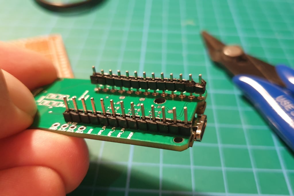 Cut the pins with pliers, trying not to scratch the board. Be careful, clipped wire ends can fly off in any direction, so make sure to wear eye protection. My cutters are not the best quality, so the trimmed pins don’t look perfect, but fortunately the final soldering will improve the overall appearance.