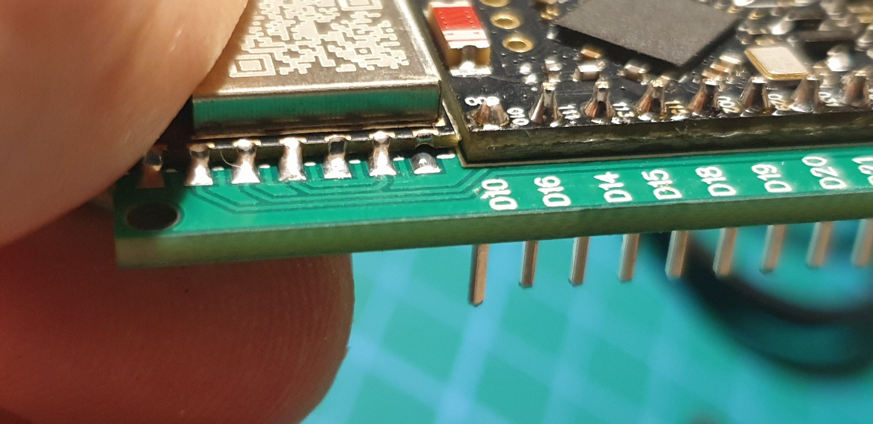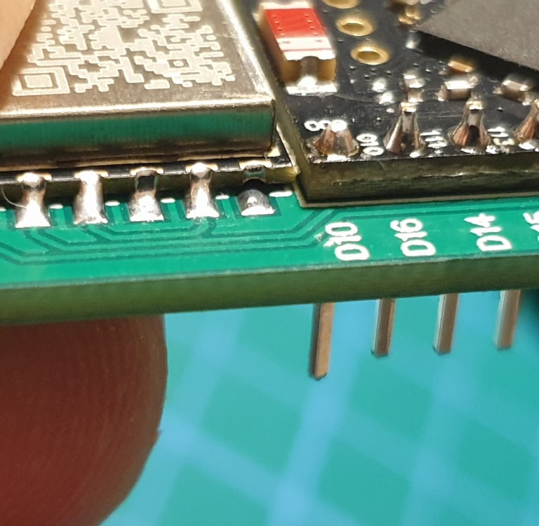 When all the solder has melted and the module is in the correct position, you can gently lift the board with tweezers and let it cool. At this stage, while the solder is still hot, the module is floating and can shift, so handle it very carefully, without tilting the board. A crookedly soldered LORA module is difficult to fix.