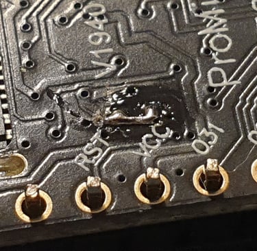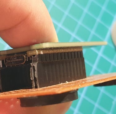 Now solder the outer pins, pressing the boards firmly together. After soldering each pin, wait a moment for it to cool before moving on to the next one. Thermal stress can cause the boards to shift out of alignment.