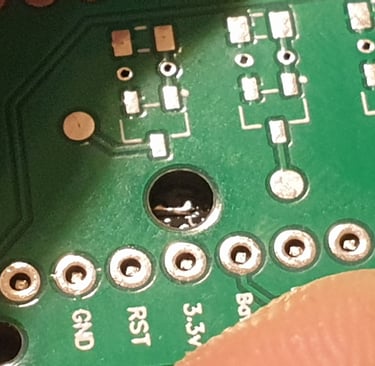 Another example of an imperfection when using a hot plate is a hollow (cold) solder joint like this. Such a defective joint must be identified and corrected during the inspection stage.
