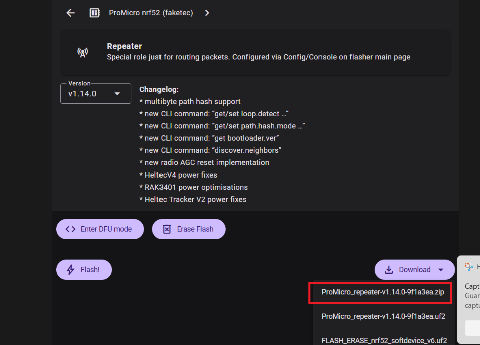 Ahora vamos a la web de meshcore y descargamos el firmware al que queremos actualizar. Tenemos que descargar el archivo con la extensión .zip