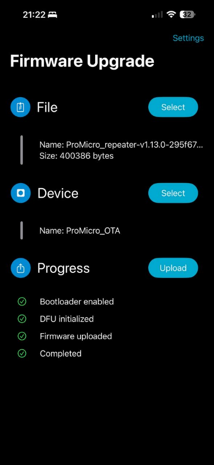 Aplicación DFU en el móvil (las capturas de esta guía es desde IOS., El proceso es exactamente el mismo para dispositivos con Android. )